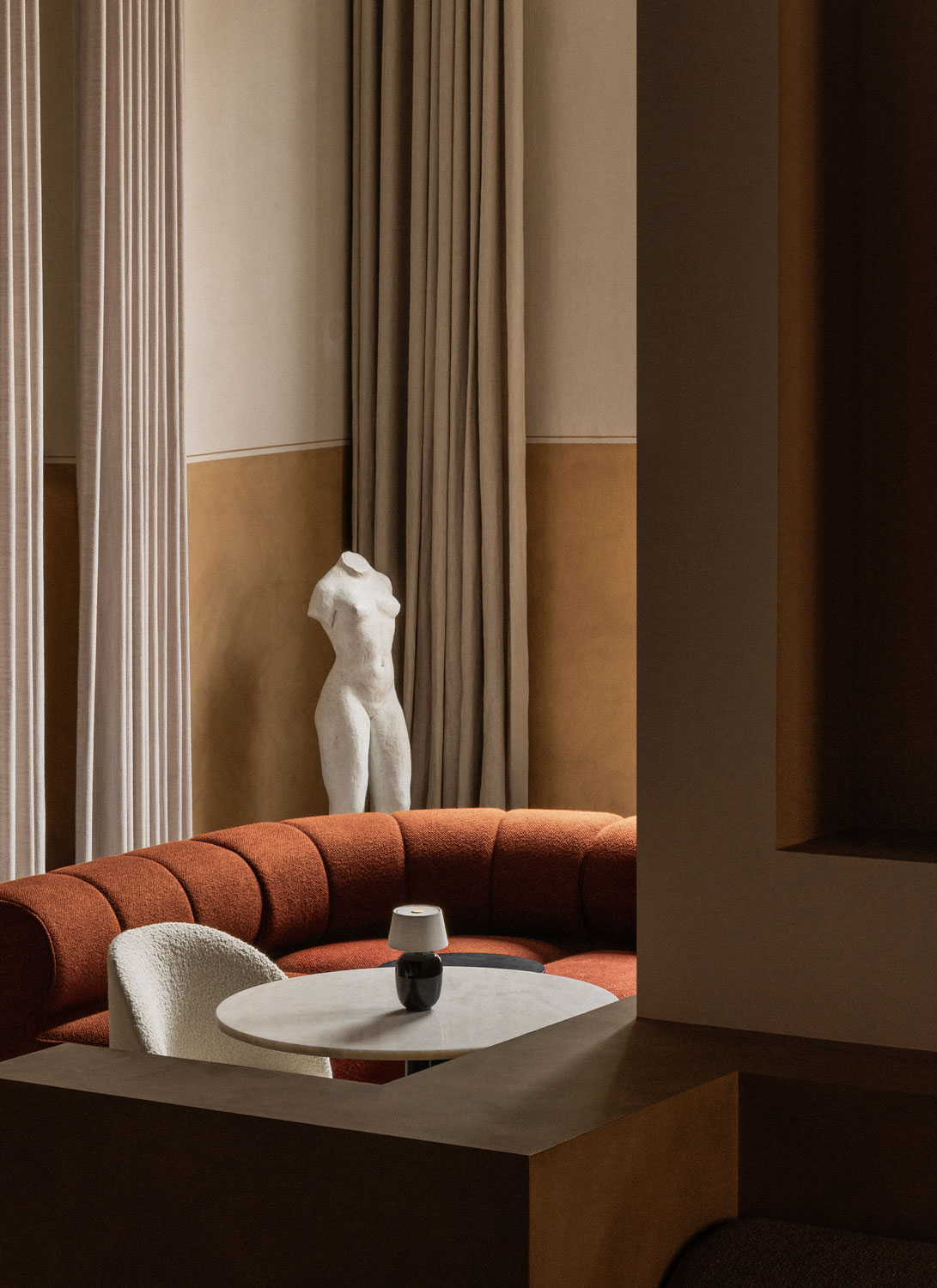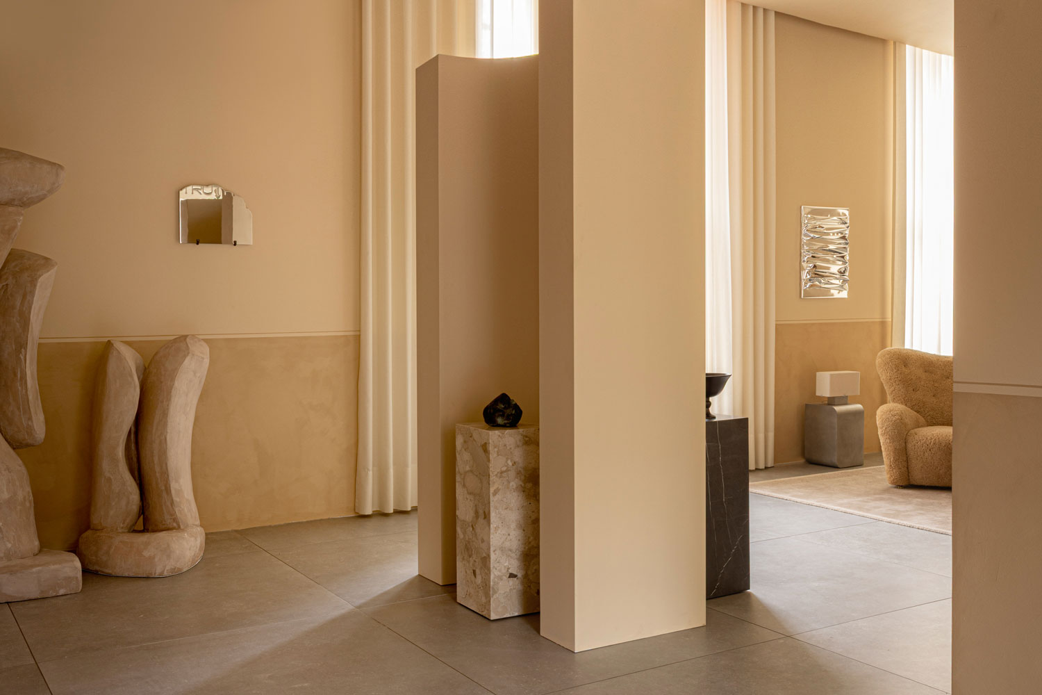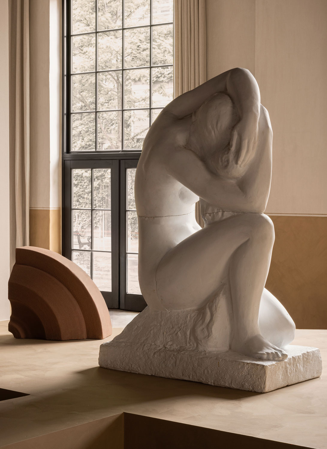 Antique sculptures and contemporary pieces are layered with skirtings, bodega curtains and subtly theatrical touches. These interpretive gestures ask what monumentality means today. Each space is a spatial meditation. Some intimate, some saturated. All designed to be felt rather than explained.