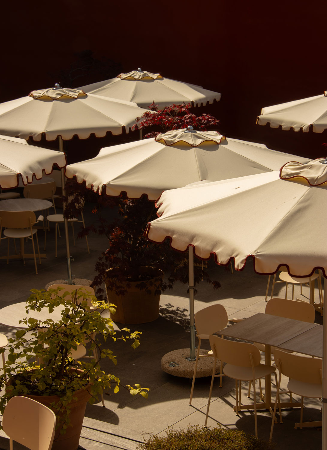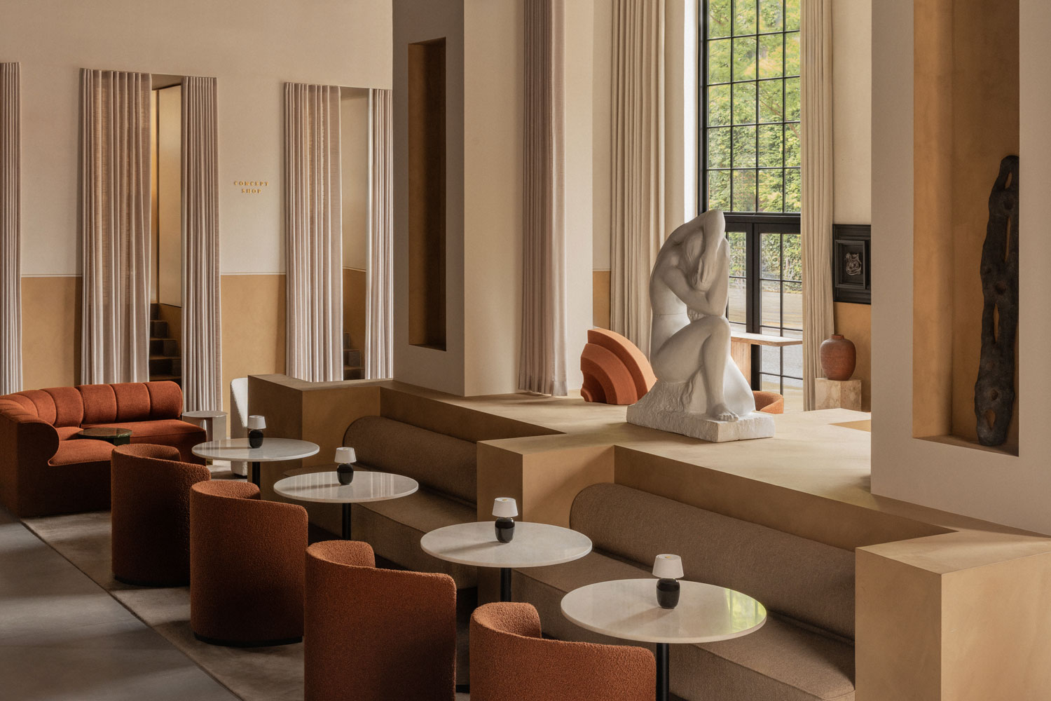 The stunning courtyard extends the architecture outward, blurring the line between interior and exterior. Inspired by classic European gardens, it creates a serene setting where carefully placed design objects, sunlight, and plants engage with the building’s form, adding scale, rhythm, and a sense of quiet reverence to the overall architectural experience.