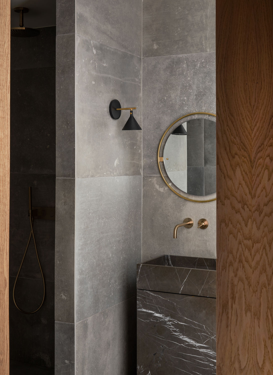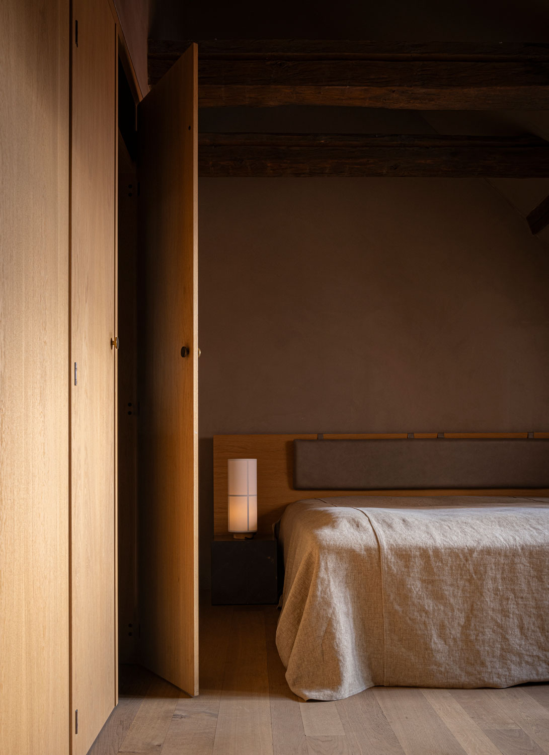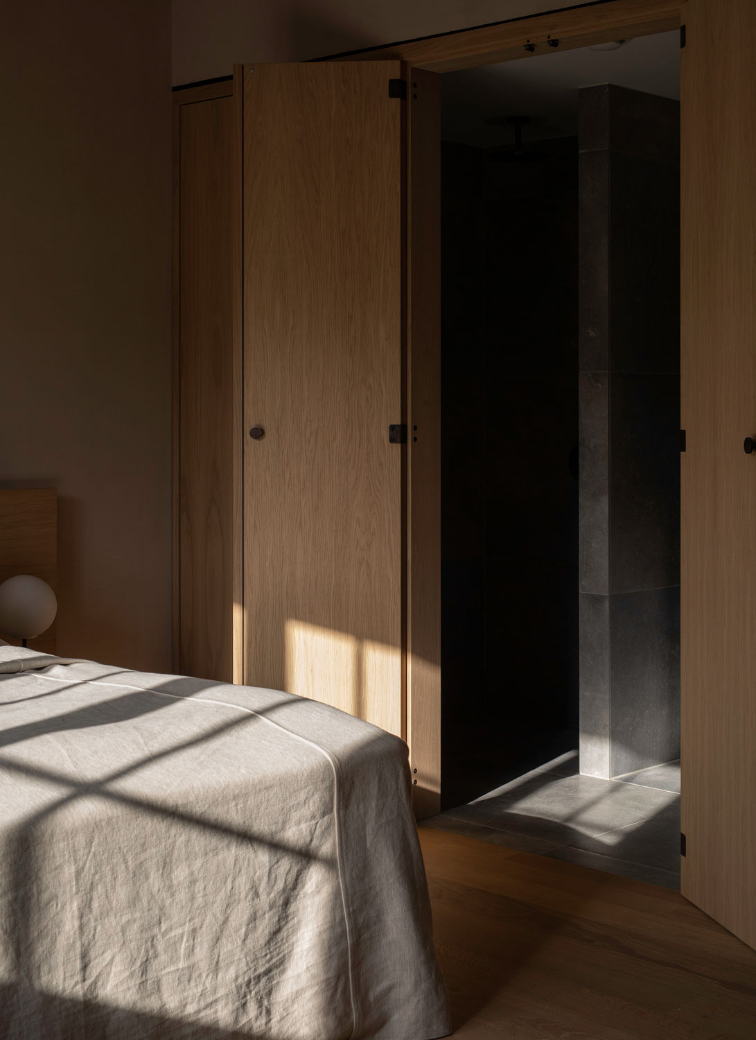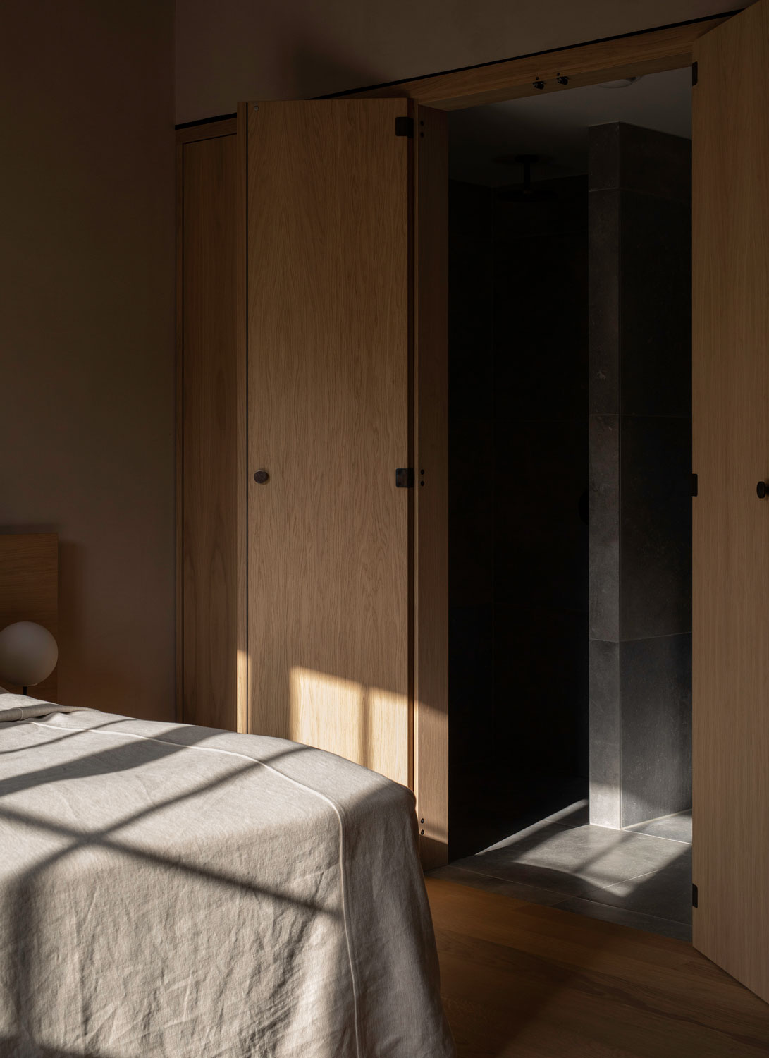 A wall of bespoke, inbuilt oak cabinetry conceals the entrance to the bathroom, creating a seamless architectural detail that blends function and form. Inside, cool stone and marble surfaces offer a striking contrast to the warm, tactile wood tones of the bedroom, resulting in a transition that feels both elegant and understatedly luxurious.