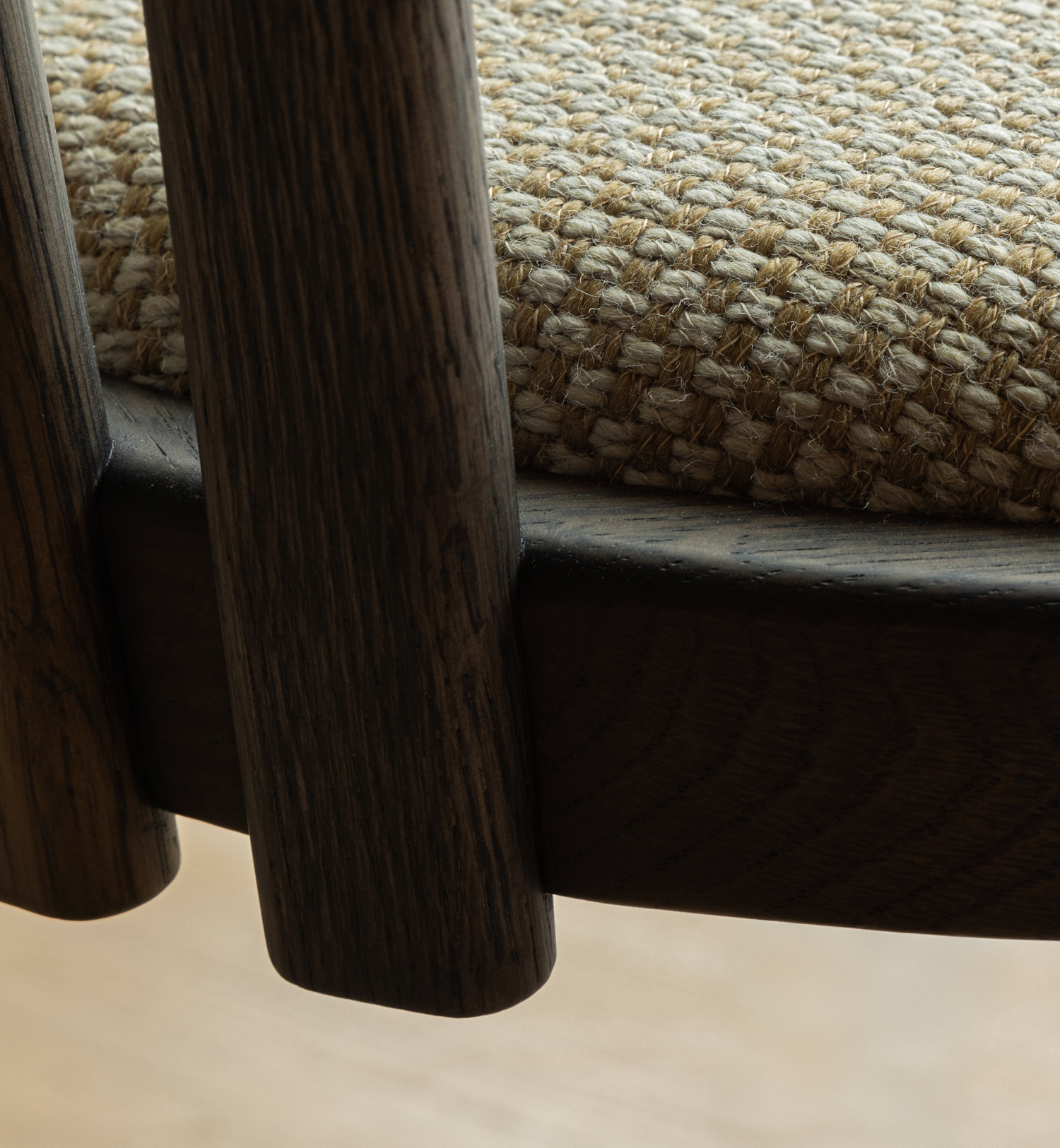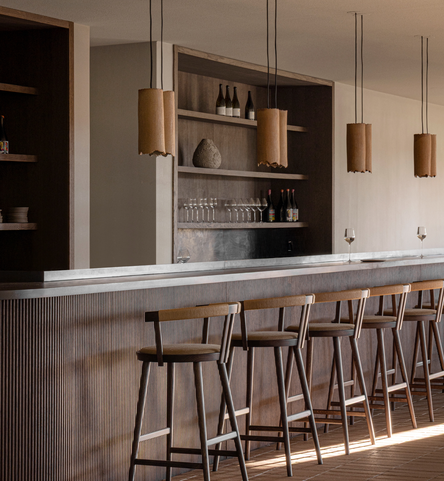 The bar stool carries the same design language as the dining chair, adapted for a higher seating position and more informal encounters. Its characteristic hourglass profile draws the structure inward toward the chamfered seat, lending the stool a poised and architectural presence at the counter. A rounded backrest wrapped in paper cord offers gentle support while accommodating different seating positions, ensuring stability and ease when sitting down or rising. The result is a bar stool that combines visual lightness with material strength, crafted to support moments of pause, conversation, and lingering.