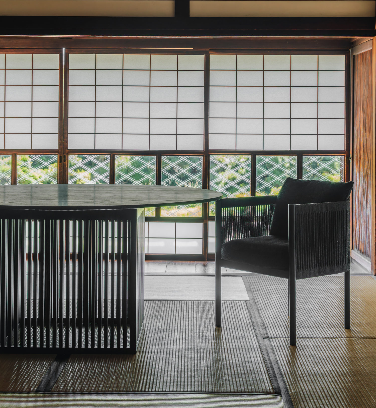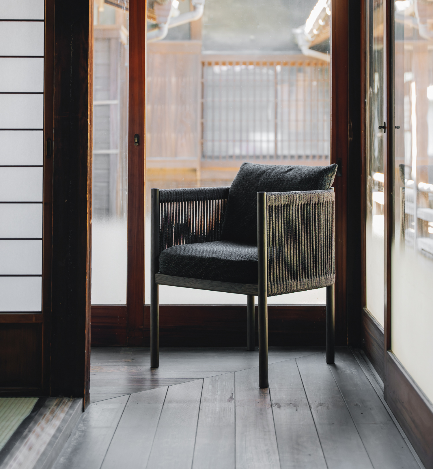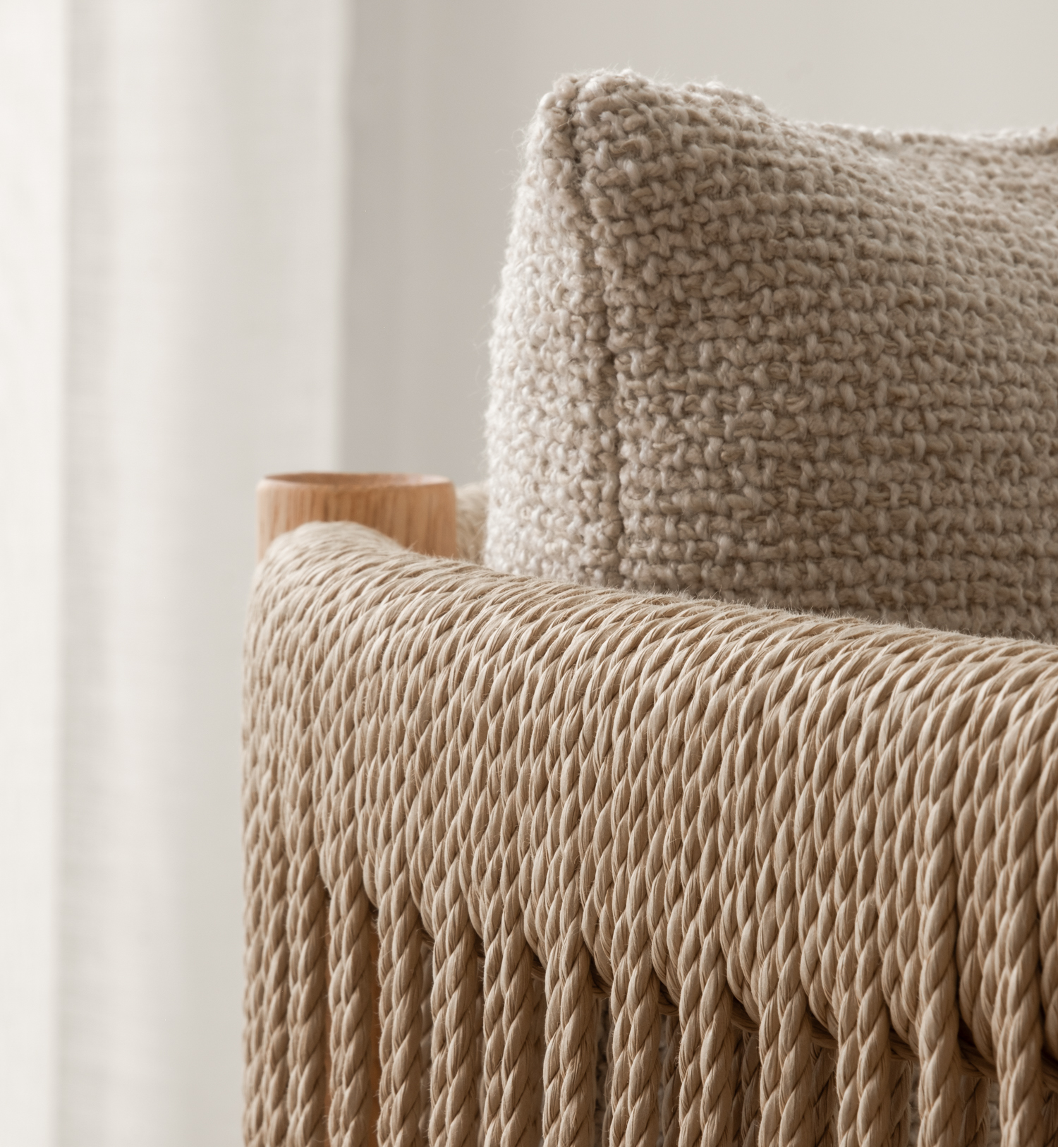 Inspired by traditional bamboo craftsmanship and tatami patterns, and subtly referencing Danish cabinetmakers like Børge Mogensen, Hans Bølling, and Finn Juhl, the collection combines warmth and restraint in a refined mix of solid oak, rich textile and braided paper cord.
