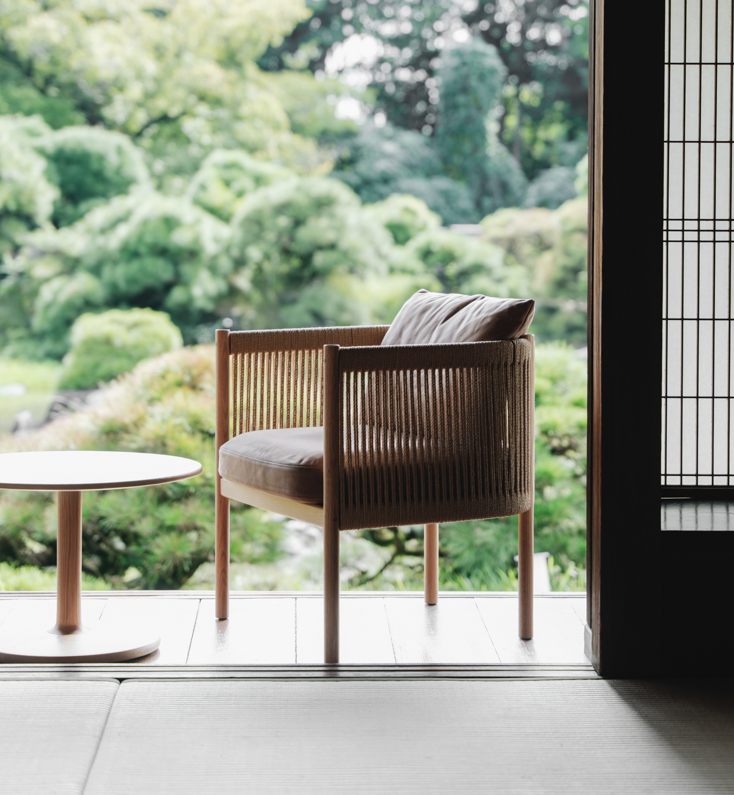 With its braided paper cord armrests and rhythmic wooden structure, the Braid Club Chair joins the Braid Sofa to complete the collection designed for Japanese Ariake.