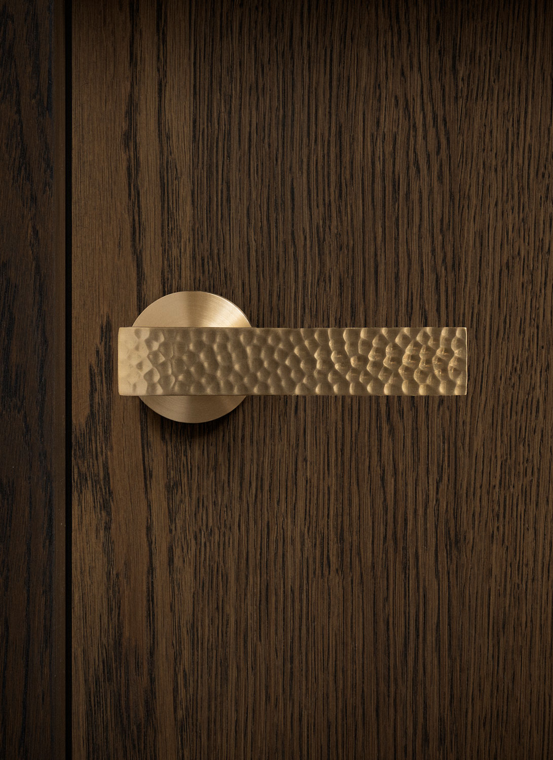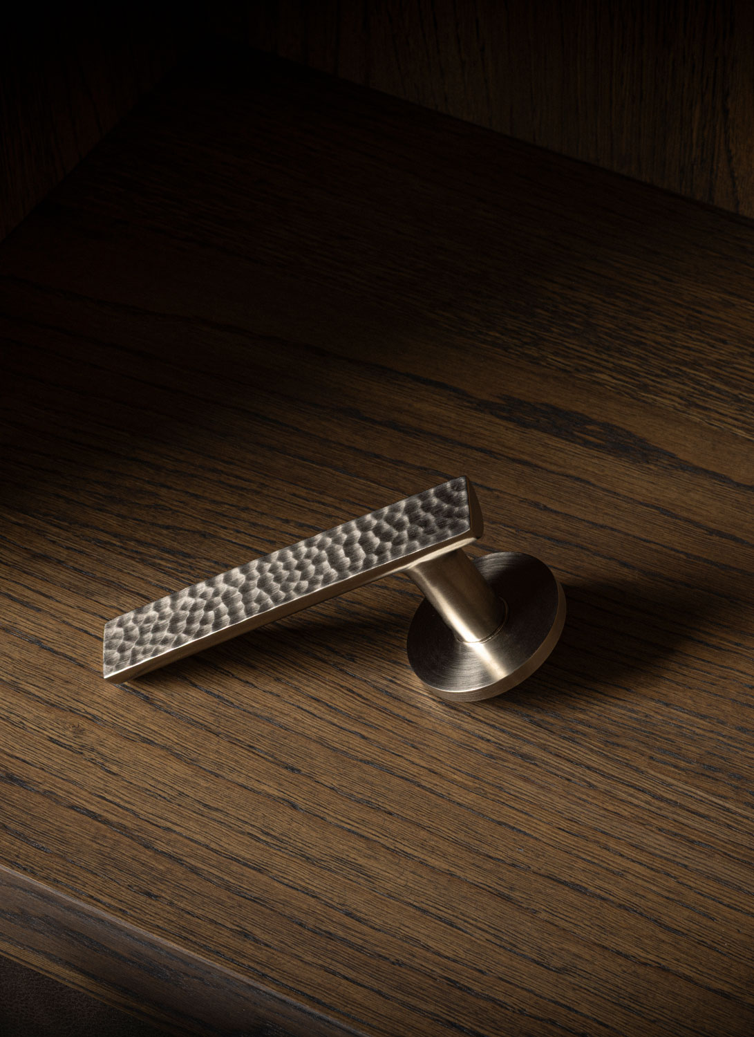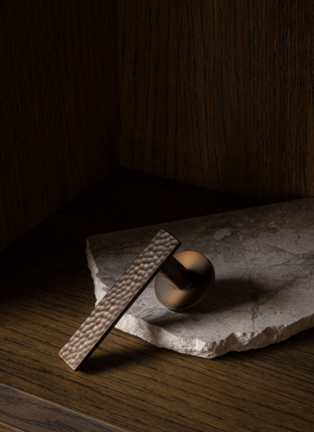 A chiseled and crafted look gives each piece in the collection a sculptural appearance, exuding a promise of tactile allure and refinement. The eye is instinctively drawn to the objects, sensing the work of hand. Inspired by surfaces found in traditional Japanese woodworking, the idea of carving the surface is translated into a smaller scale and a new material. The rugged and tactile surface of the hardware changes dramatically with the passing of time and the change of light.
