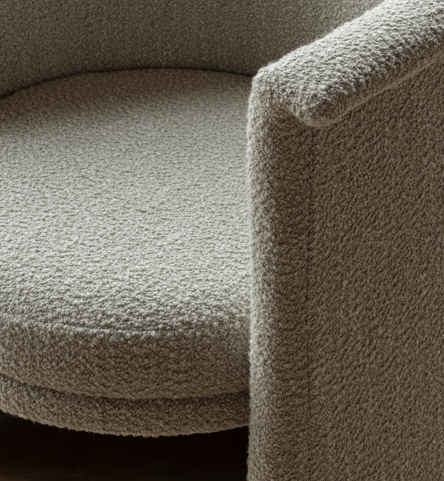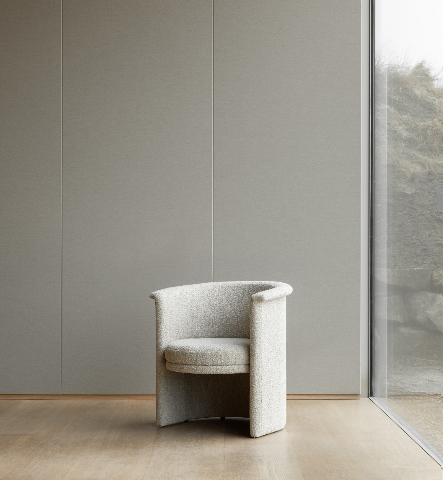 The chair rests on a hollow, cylindrical base that grounds the design and suspends the seat above the floor. Integrated armrests emerge gently from the form itself, offering natural support while also making the chair easy to reposition. Fully upholstered, the surface reads as calm and tactile, inviting moments of rest and unhurried conversation.