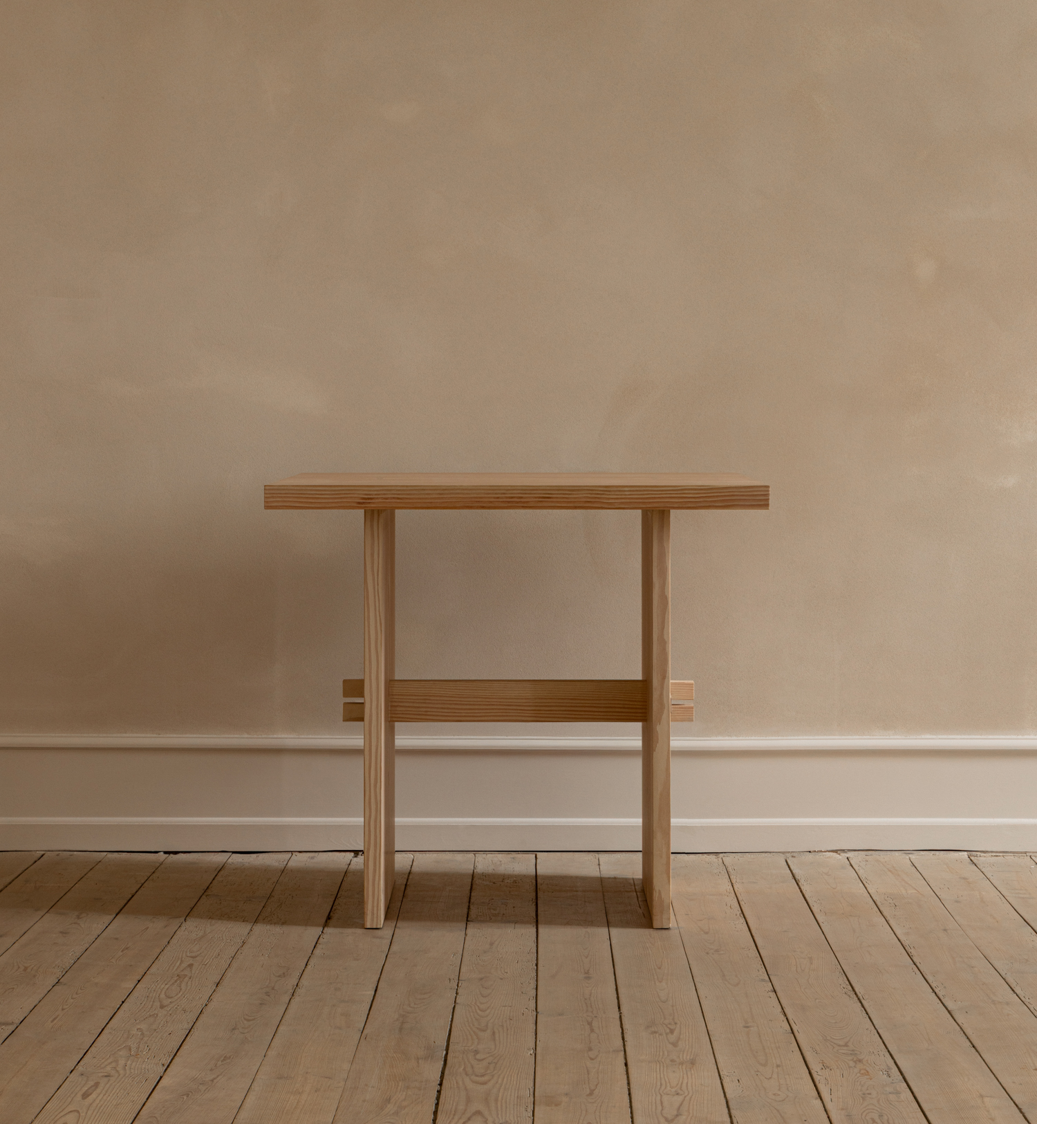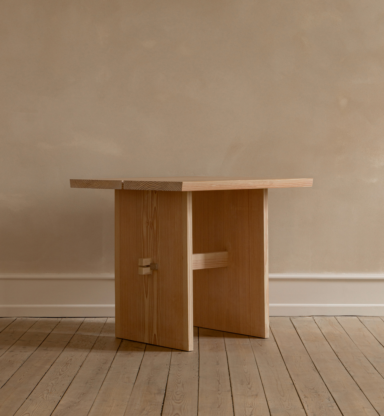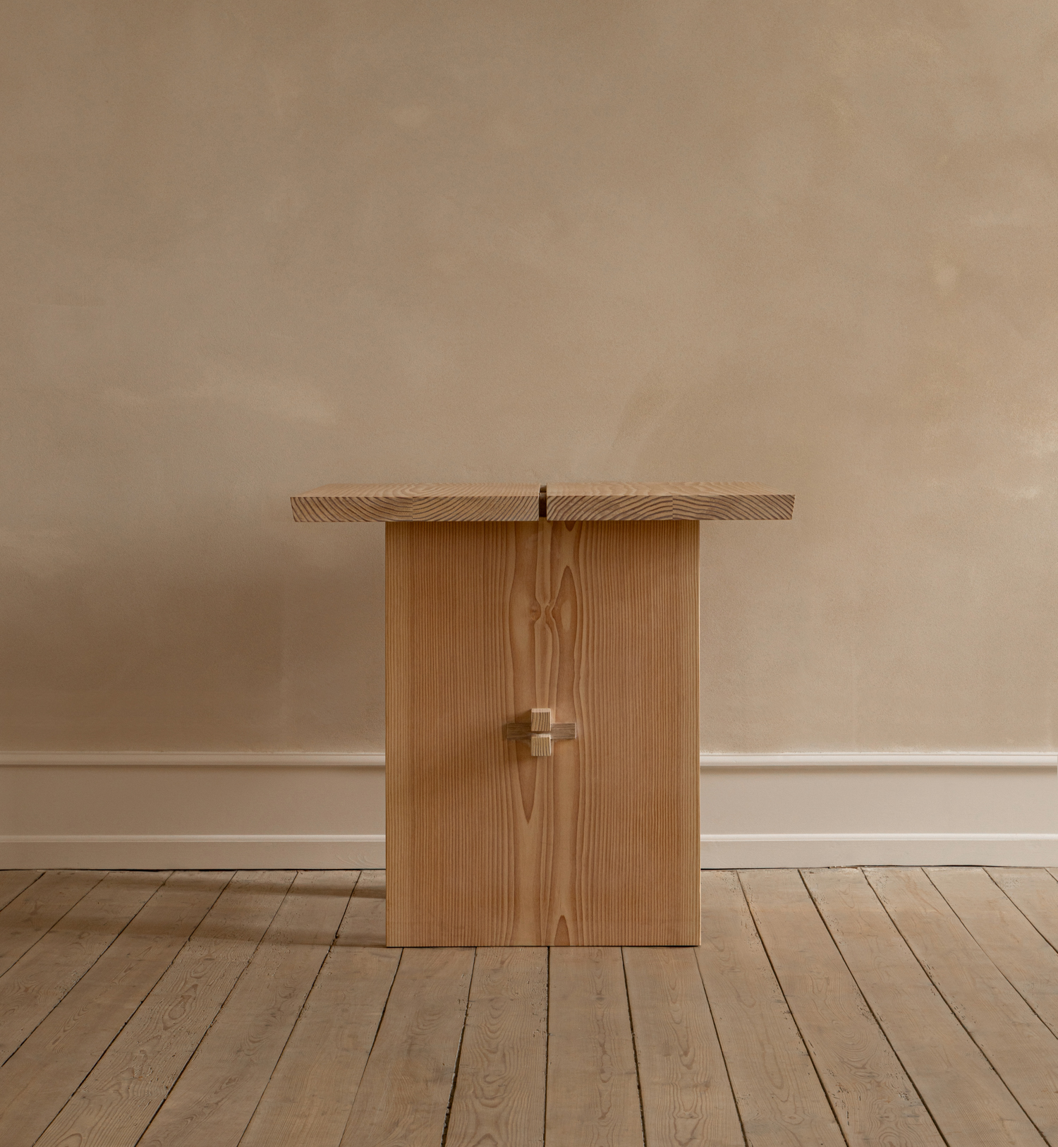 Designed for Galleri Sonja, the bespoke table is conceived as a quiet architectural object. The solid wooden tabletop is supported by carefully positioned vertical planes, joined through visible wooden keys that express both structure and craft. The construction is deliberate and grounded, creating a sense of stability without visual weight. Reduced to its essential elements, the table offers a versatile surface for daily rituals at the gallery, while allowing the character of the material and the precision of the joinery to define its presence.