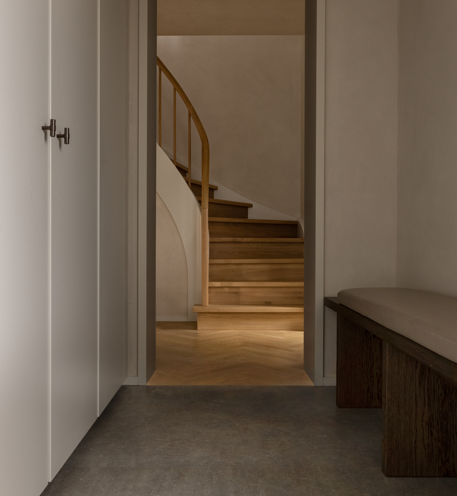 Designed as a bespoke addition to the Waterfront House, the dark walnut bench strikes a balance between structure and softness. A long apron supports the seat, topped by an elegant leather cushion, while the legs introduce a sense of rhythm that echoes the architectural language of the surrounding space.